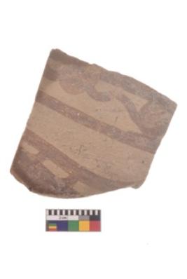 | Description / विवरण | Specimen of red on red ware with decorative Bnads of horizonatl lines consisting of curved lines intersecting circles on top and vertical lines at the bottom geometric painting. |