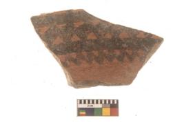 | Description / विवरण | Specimen of Potsherd with black decorative geometric diamond set broad horizontal bands painting . |