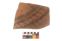 | Description / विवरण | Specimen of Potsherd black on red painted pottery. It is fine fabric in sharp contrast with painted design are executed in black pigment. |