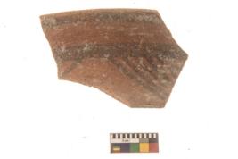 | Description / विवरण | Specimen of Potsherd with black decorative linear painting . |