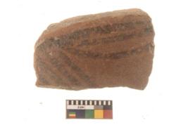 | Description / विवरण | Specimen of a Potsherd with black decorative geometric painting on it.while between them are set of triple aches. |