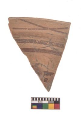 | Description / विवरण | Specimen of black on red ware with black decorative overlapping lines with a band of horizontal lines and a graffiti at the bottom geometric painting. |