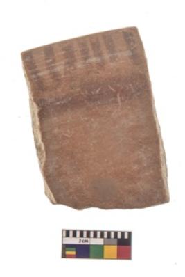| Description / विवरण | Specimen of black on red ware with black decorative Vertical lines on the rim geometric painting. |