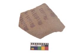 | Description / विवरण | Specimen of red on red ware with black decorative Bands of parallel small vertical strokes geometric painting. |