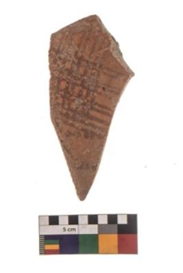 | Description / विवरण | Specimen of black on red ware with black decorative Lattice design geometric painting. |