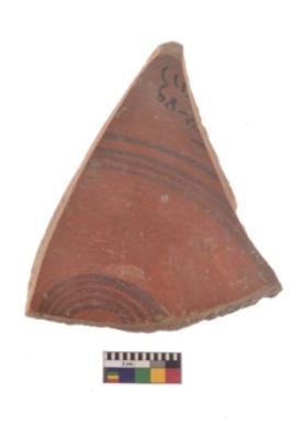 | Description / विवरण | Specimen of black on red ware with black decorative Horizontal lines with concentric circles below geometric painting. |