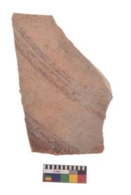 | Description / विवरण | Specimen of black on red ware with black decorative Bands of horizontal lines geometric painting. |