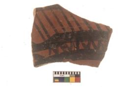 | Description / विवरण | Specimen of Potsherd black on red painted pottery. It is fine fabric in sharp contrast with painted design are executed in black pigment. |