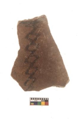 | Description / विवरण | Specimen of a Potsherd with black decorative geometric painting on it.It is set of two zigzag bands. |