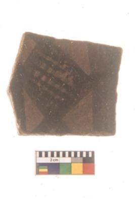 | Description / विवरण | Specimen of Potsherd with black decorative geometric diamond set broad horizontal bands painting . |