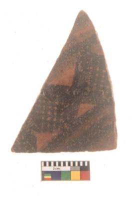 | Description / विवरण | Specimen of Potsherd with black decorative geometric diamond set broad horizontal bands painting . |