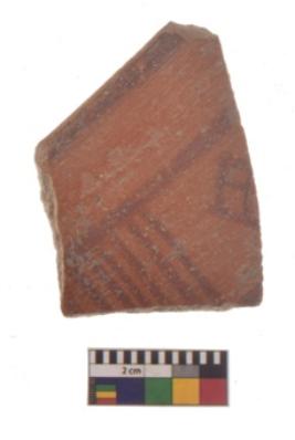 | Description / विवरण | Specimen of black on red ware with black decorative Two horizontal lines with vertical lines below and a diamond lattice on the right geometric painting. |
