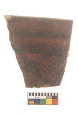 | Description / विवरण | Specimen of Potsherd with black decorative geometric diamond set broad horizontal bands painting . |