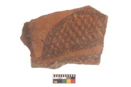 | Description / विवरण | Specimen of black on red ware with black decorative Lattice pattern in a semi circle geometric painting. |