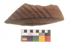 | Description / विवरण | Specimen of Potsherd black on red painted pottery. It is fine fabric in sharp contrast with painted design are executed in black pigment. |