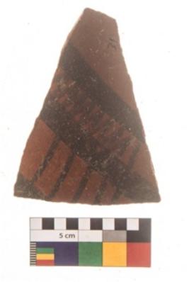 | Description / विवरण | Specimen of Potsherd black on red painted pottery. It is fine fabric in sharp contrast with painted design are executed in black pigment. |