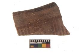 | Description / विवरण | Specimen of black on red ware with black decorative Horizontal lines with attached vertical lines geometric painting. |