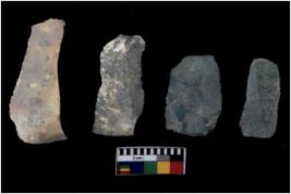 | Description / विवरण | There are n 4 flakes tool; there are flakes tool with prominent flaking marks. It made up of a large flakes with sides trimmed. It is rectangular in shaped. |