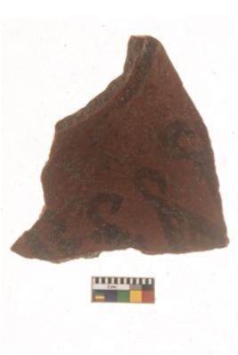 | Description / विवरण | Specimen of Potsherd black on red painted pottery. It is fine fabric in sharp contrast with painted design are executed in black pigment. |