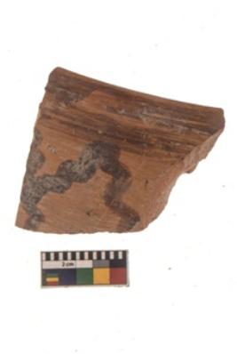 | Description / विवरण | Specimen of black on red ware with black decorative Wavy lines forming and arch geometric painting. |