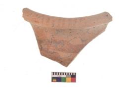 | Description / विवरण | Specimen of black on red ware with black decorative Vertical lines in the rim with horizontal bands on the neck geometric painting. |