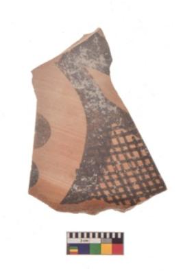 | Description / विवरण | Specimen of black on red ware with black decorative Semi circle with two dots in between and lattice pattern at the right geometric painting. |