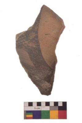 | Description / विवरण | Specimen of black on red ware with black decorative Semi circle with lattice design geometric and nature painting. |