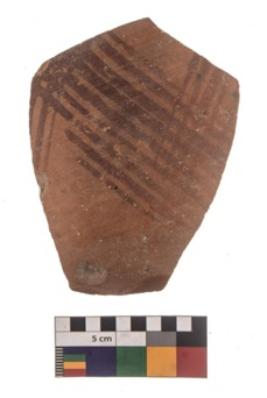 | Description / विवरण | Specimen of black on red ware with black decorative Lattice design geometric painting. |