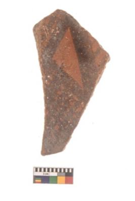 | Description / विवरण | Specimen of black on red ware with black decorative Triangle with latice pattern below geometric painting. |