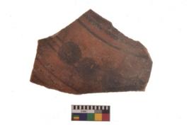 | Description / विवरण | Specimen of black on red ware with black decorative Horizontal lines intersecting with circles in between geometric painting. |