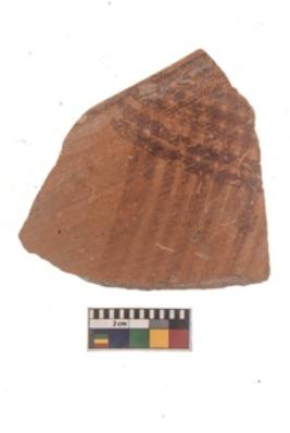 | Description / विवरण | Specimen of red ware with black decorative Lattice pattern geometric painting. |