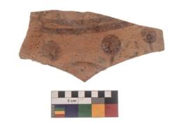 | Description / विवरण | Specimen of red ware with black decorative Horizontal lines with circles below geometric painting. |