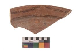 | Description / विवरण | Specimen of red ware with black decorative Curved line and a horizontal line below geometric painting. |