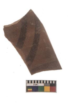 | Description / विवरण | Specimen of black on red ware with black decorative Parallel curved lines geometric painting. |
