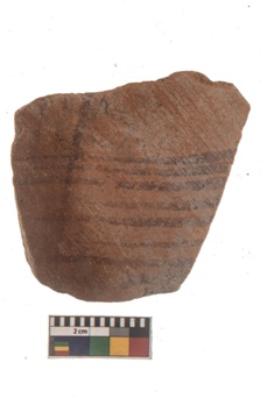 | Description / विवरण | Specimen of black on red ware with black decorative Parallel lines geometric painting. |