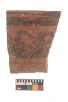 | Description / विवरण | Specimen of black on red ware with black decorative Horizontal band with joined curves below geometric painting. |