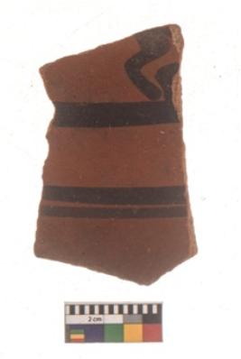 | Description / विवरण | Specimen of red on red ware with black decorative Bands of horizontal lines with small zigzag lines at right corner geometric painting. |