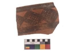 | Description / विवरण | Specimen of black on red ware with black decorative Diamond shaped lattice between horizontal lines geometric painting. |