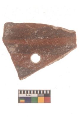 | Description / विवरण | Specimen of black on red ware with black decorative Horizontal lines with a perforation at the centre geometric painting. |