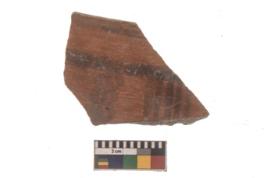 | Description / विवरण | Specimen of black on red ware with black decorative Horizontal lines with vertical lines on the right geometric painting. |