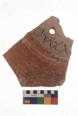| Description / विवरण | Specimen of red ware with decorative Engraved crisscross pattern incisions. |