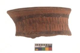 | Description / विवरण | Specimen of black on red ware with black decorative Horizontal lines with zigzag lines in between geometric painting. |
