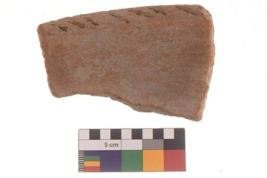 | Description / विवरण | Specimen of red ware with decorative incisions Vertical parallel lines at the rim . |