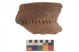 | Description / विवरण | Specimen of red ware with decorative incisions Vertical parallel lines . |