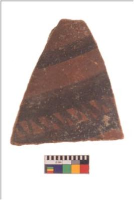 | Description / विवरण | Specimen of black on red ware with black decorative broad horizontal lines and intersecting wavy lines geometric painting . |