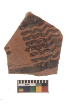 | Description / विवरण | Specimen of black on red ware with black decorative Wavy lines geometric painting. |