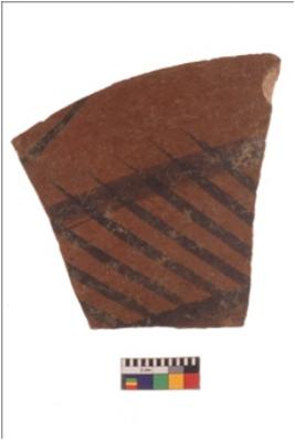 | Description / विवरण | Specimen of black on red ware with black decorative broad horizontal lines and slanting vertical lines geometric painting . |