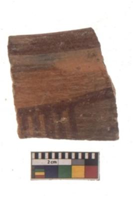 | Description / विवरण | Specimen of black on red ware with black decorative Horizontal line with small vertical projections geometric painting. |