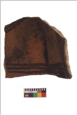 | Description / विवरण | Specimen of black on red ware with black decorative broad horizontal lines and vertical lines geometric painting . |