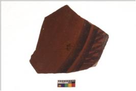| Description / विवरण | Specimen of black on red ware with black decorative curvy vertical lines and intersecting wavy lines geometric painting . |